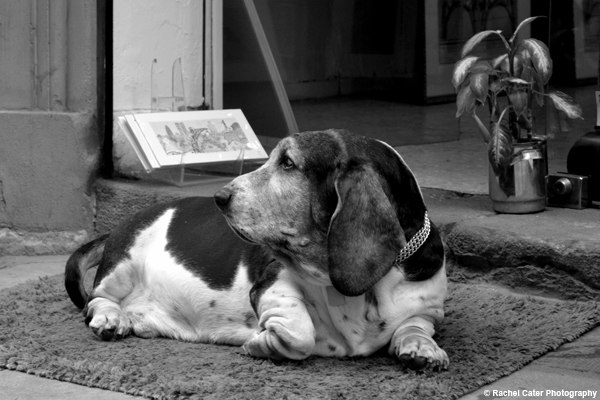 I took this photo in Spain. I was drawn to the dog relaxing in front of a store.